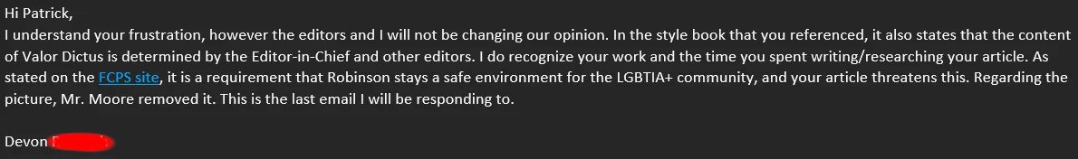 My article apparently threatened the “LGBTIA+ community [sic]” and thus was not published, and my image was removed by Mr Moore who evidently possessed more editorial control than he had previously admitted. My suspicion is that it was Mr Moore who suggested that Devon stop responding to my emails, but I can’t say that for sure. I sent off an email to the other editors in a sort of last appeal, but it came to nothing, and I forgot to save the exchange. The long and short of it was that I didn’t think the publication of a single article could render an entire school unsafe.
