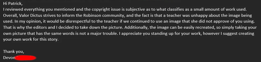 Frustrated but not yet discouraged, I proceeded to email Devon, the editor in chief with an email explaining in comprehensive detail why fair use was applicable in the case of my email. The response I got was surprisingly conciliatory, and shockingly absurd.